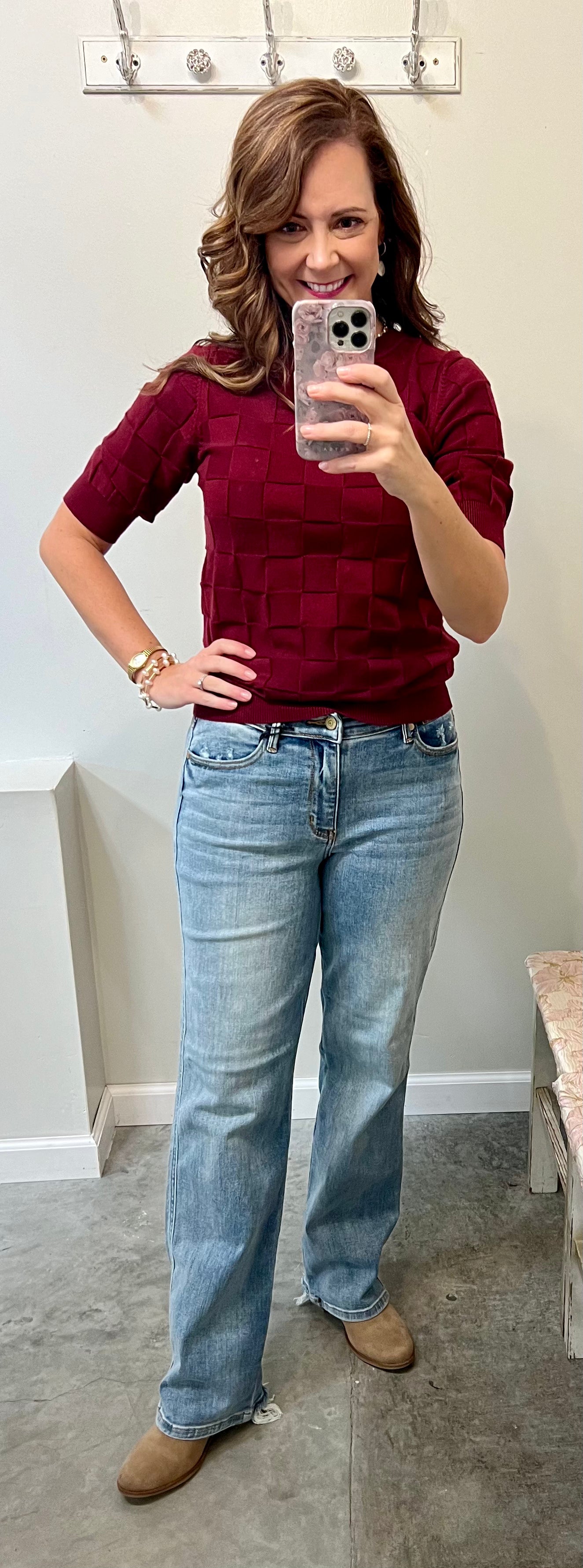 These mid rise jeans have a light wash and straight leg. Pairs nicely with heels or your favorite bootie.